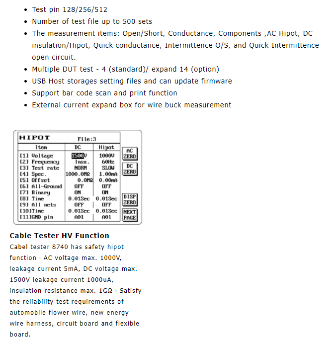 The measurement items of 8740 cable or harness tester have (1) Open/Short;(2) Conductance; (3) Components; (4) AC Hipot; (5) DC insulation/ Hipot; (6) Quick conductance (7) Intermittence O/S, and (8) Quick Intermittence open circuit. It supports RS-232, USB Host, Print, Remote interfaces.