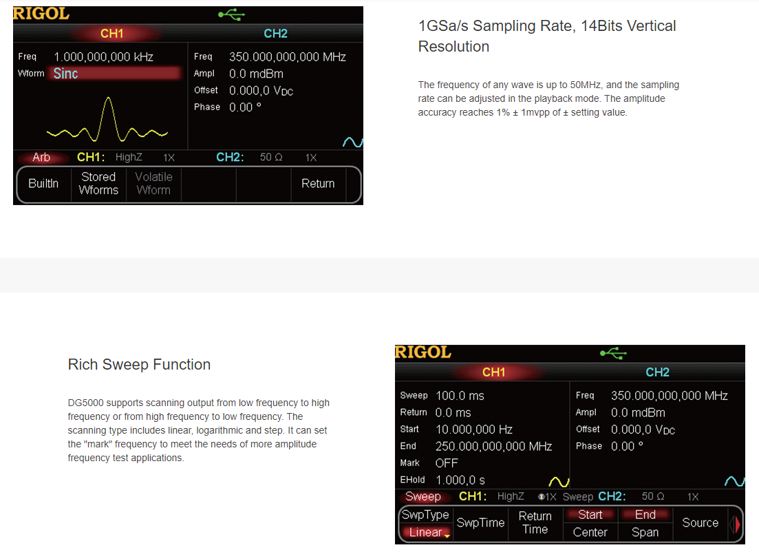 Dg5000 series has 6 functions, including any waveform generator, pulse generator, IQ baseband / if source, frequency hopping source, code generator and function generator. The series includes single and dual channel models. The functions of the two channels are completely equal, and the phase between channels is precisely adjustable.