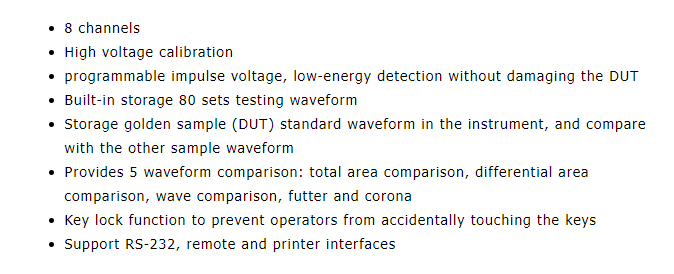 Coils are used in a wide range of applications e.g. transformer, motor, generator, ignition coil for cars and motorcycles, relay, electromagnet, filter and various inductors, nearly all the electronic and electrical products have to use coils. However, coils do not have a complete automatic manufacturing process like standard electronic components, and the existing enameled wires are neither fault-free during production nor ensure 100% quality guarantee. 7720 is 8 channels, 5000V impulse winding tester that provides the comparison of waveform functions e.g. Area under curve ratio, Area size ratio, Voltage time difference, and you can use the cursor to select desired comparison range to cover all the waveform differences created by electrical properties then detect a faulty component. This model offers various harmonics mode and accommodate all kinds of coils, and become the best tester that you are able to find on the market to certify coil quality.